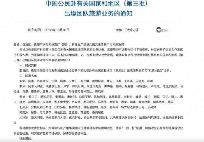 8月11日,文化和旅游部办公厅发出通知,公布了第三批恢复出境团队游的国家和地区。即日起,恢复包括美国、澳大利亚、日本、韩国、土耳其等国家和地区的出境团队旅游和“机票+酒店”业务。