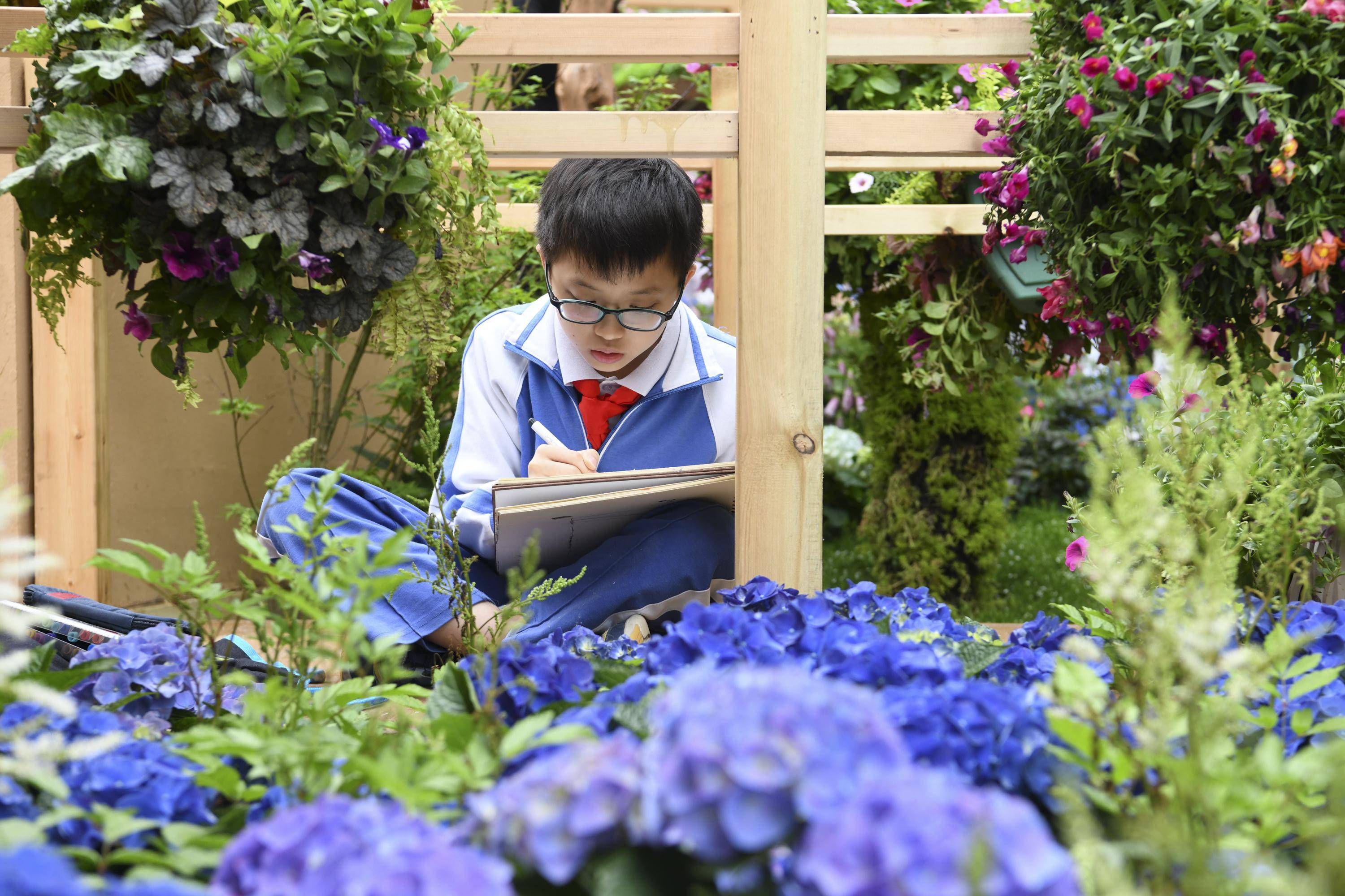 4月8日,在2023粤港澳大湾区花展现场,一名小朋友在写生。 新华社记者 梁旭 摄