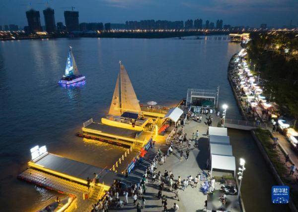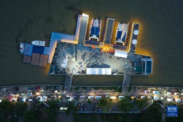 游人在西安市浐灞生态区一处游船码头和后备箱集市上游览(8月10日摄,无人机照片)。