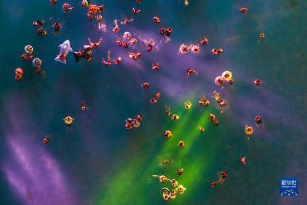 游客在西安市浐灞生态区一家水上乐园内游玩(8月10日摄,无人机照片)。