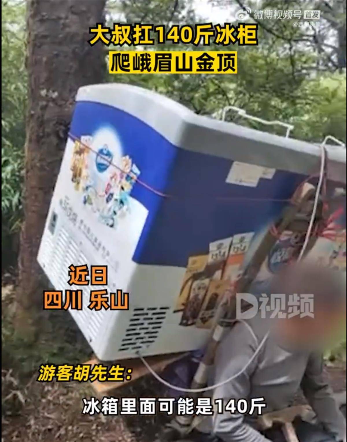 游客胡先生表示,他7月底去爬峨眉山,在快到金顶的位置,遇到一大叔扛着冰柜正在休息,询问得知,冰柜大概有140斤。