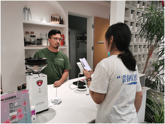 郑丹萍与雨木花园咖啡厅工作人员进行沟通。
