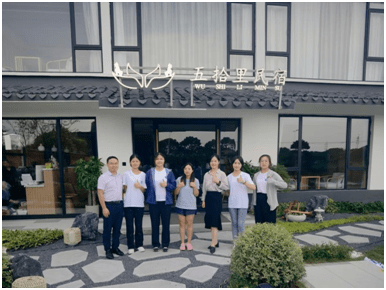五拾里民宿负责任人郭总(右三)、汉孚书院王老师(中间)、指导老师卢老师(左一)与团队成员合影。
