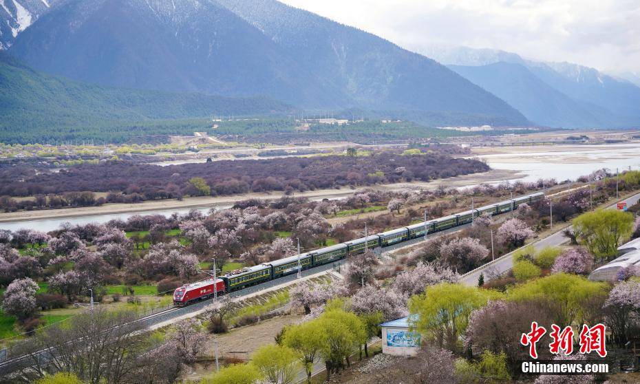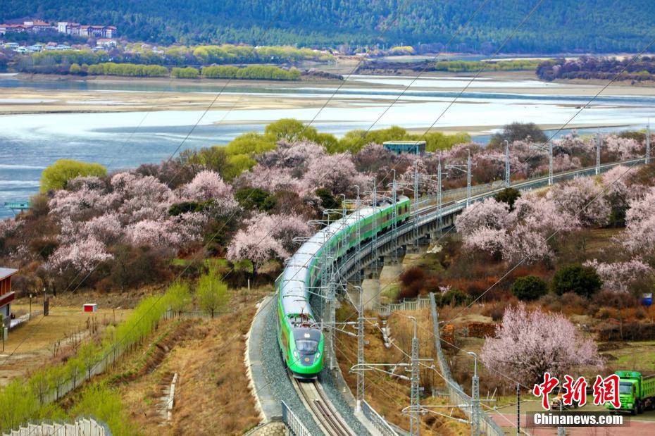 近日,中国铁路青藏集团有限公司介绍,3月下旬至4月,拉林铁路沿线绵延的野生桃花林盛开,蓝天、白云、桃花、雪山、高原复兴号动车等相互交织,形成了一幅幅美不胜收的画面。图为穿梭在桃花林中的拉林铁路高原复兴号。