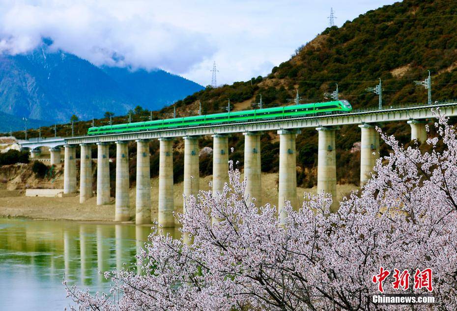 西藏拉林铁路是一条连接西藏自治区拉萨市与林芝市的国铁Ⅰ级单线电气化铁路,全长435公里,设计时速160公里,于2021年6月25日开通运营。图为桃花、嫩柳与国槐绿涂装的高原复兴号。