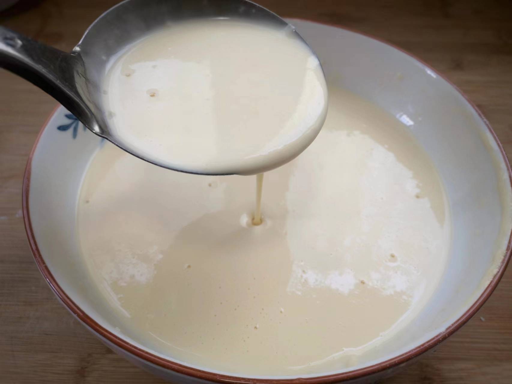4、面粉的量可以根据人口的多少随意添加,照着一个方面不停的搅拌,搅拌稠成糊,不能有小面疙瘩。