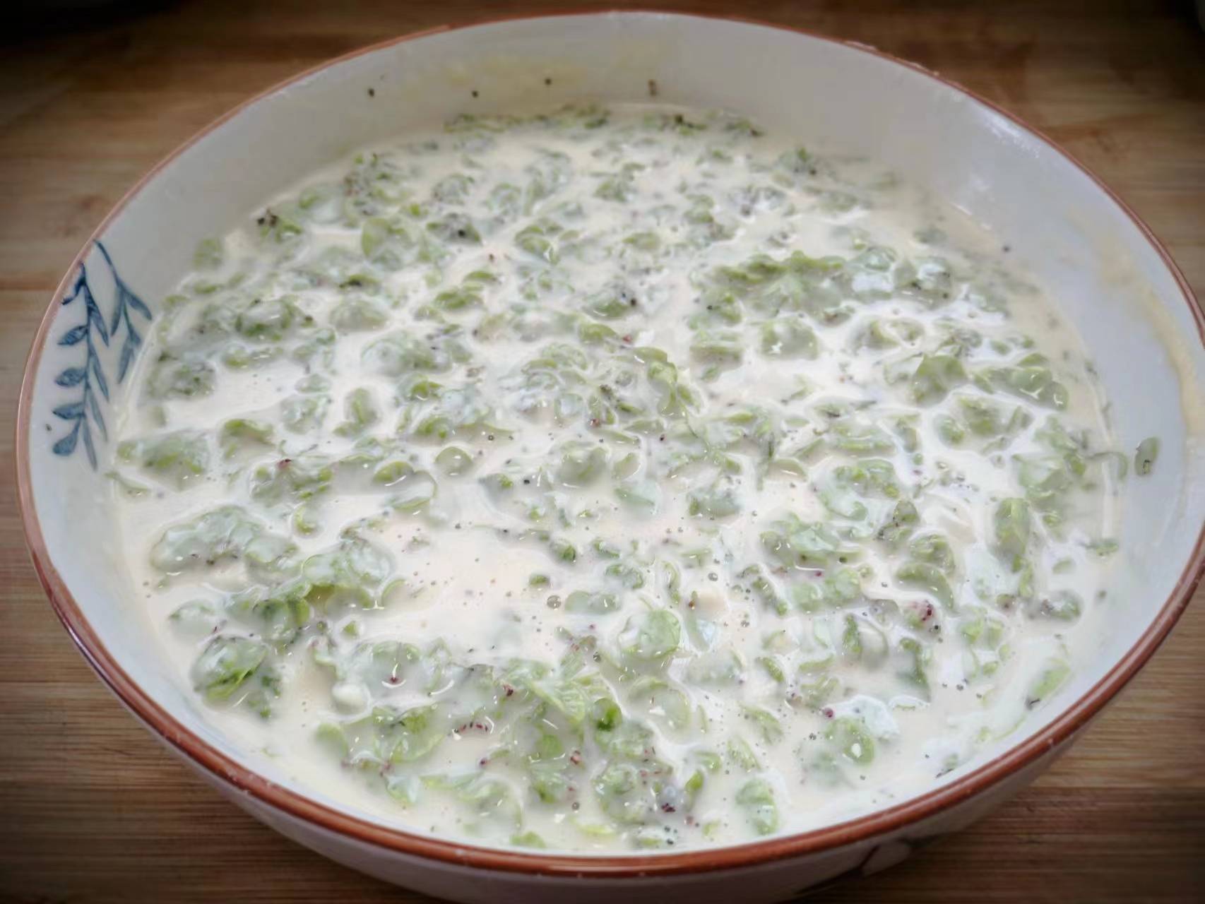 6、接着把洗好的榆钱从水中捞出来,放入面糊里,然后放入食盐和五香粉调味,搅拌均匀。