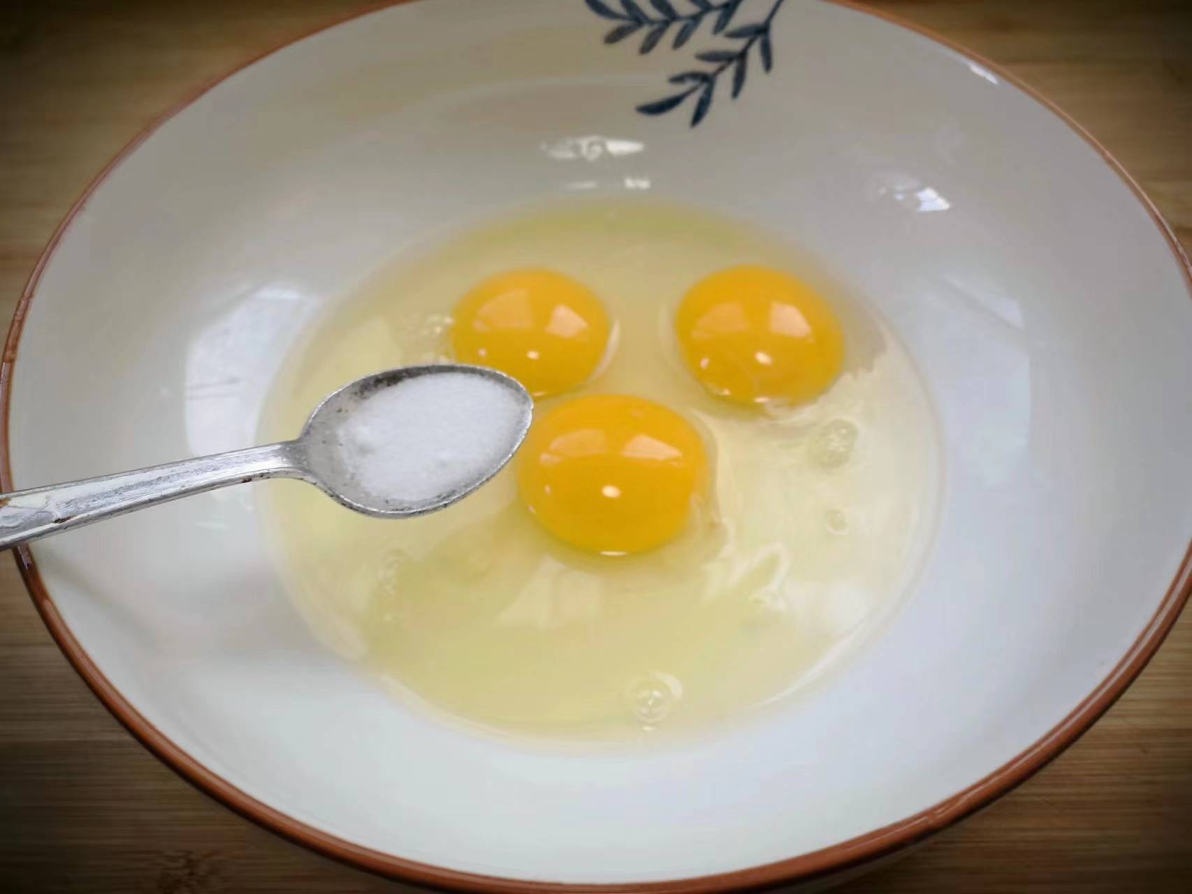 3、取一个大盆打入3个鸡蛋,加少许盐,用筷子充分搅拌均匀。