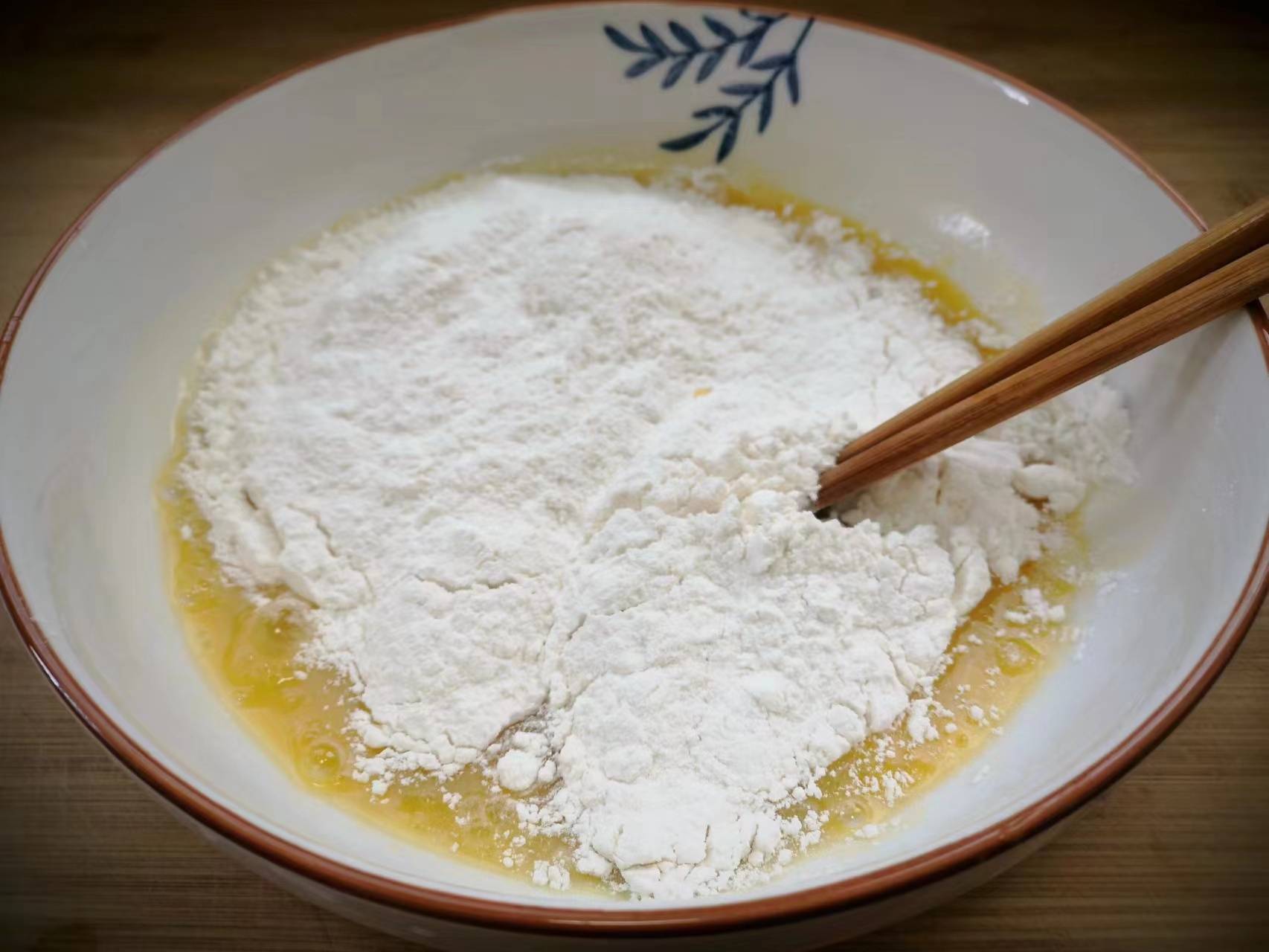 5、接着倒入适量的清水,慢慢搅拌成糊状,面糊搅成可以拉成丝即可,不能太稠或者太稀,放置5分钟。
