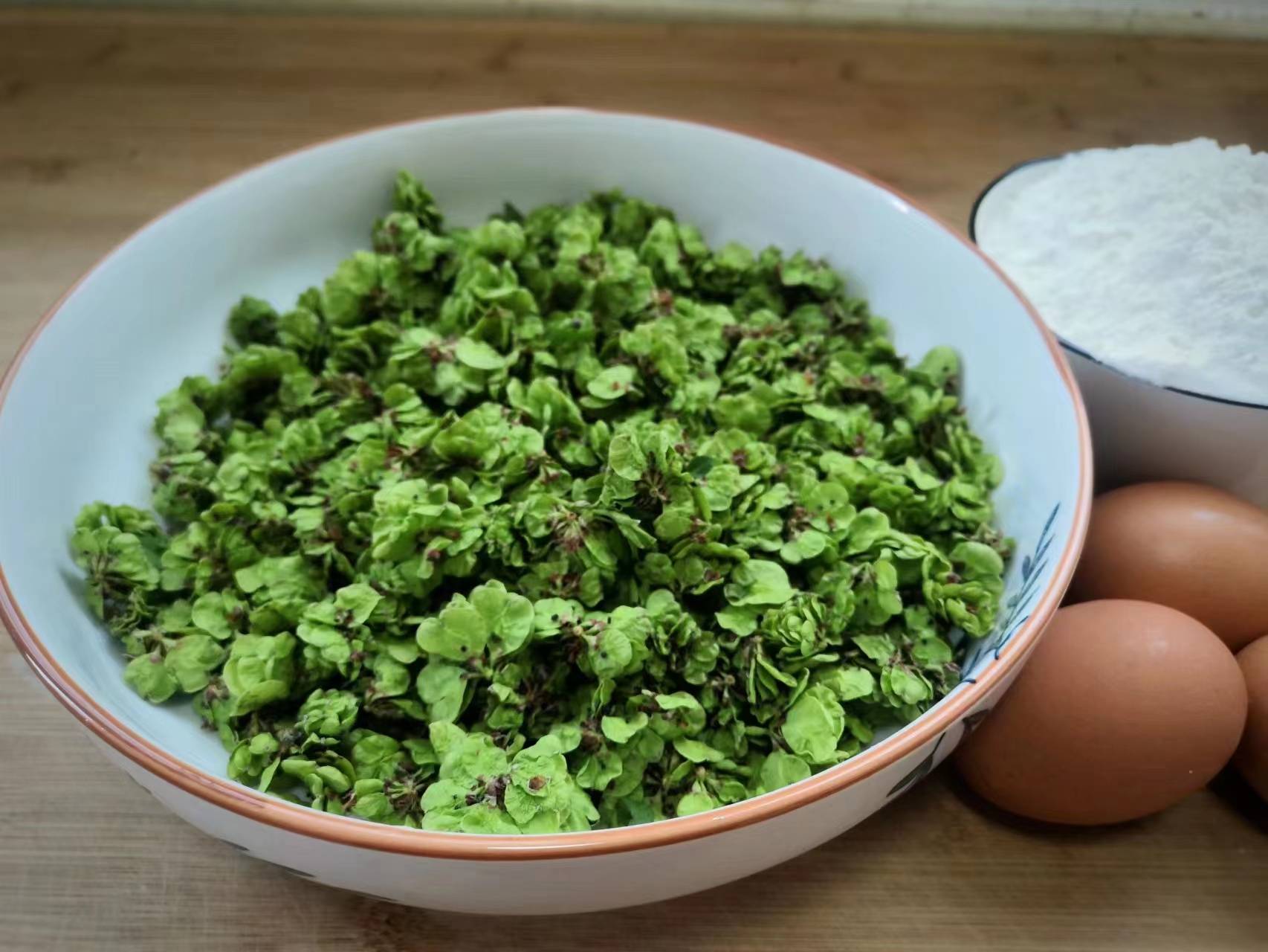食材:榆钱、鸡蛋、面粉、盐、五香粉、清水。