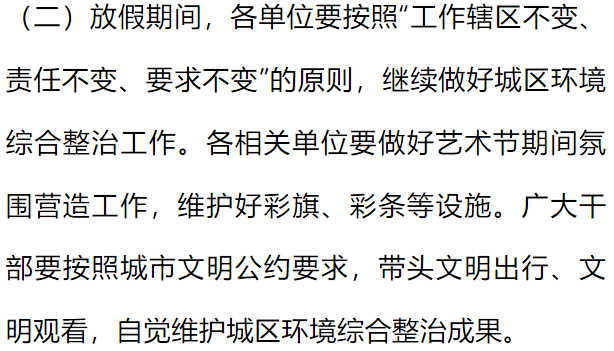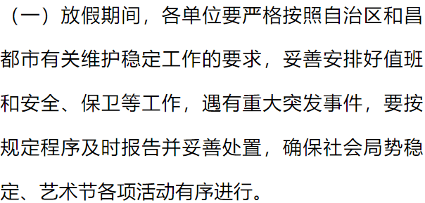 根据《国务院关于全国年节及纪念日放假办法》规定及《昌都市第一届人民代表大会常务委员会关于批准市政府提请设立“昌都市三江茶马文化艺术节”的议案的决定》精神,并经市委办公室、市政府办公室同意,现就西藏昌都第九届三江茶马文化艺术节放假安排有关事宜通知如下: