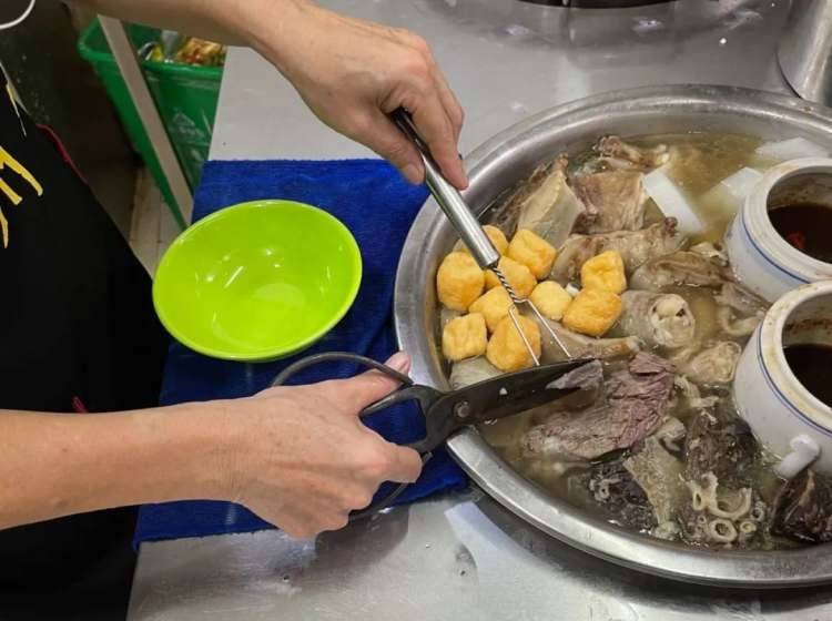 老板站在一大锅滚烫的牛杂前,食客围炉聚集,只需要跟老板说想吃什么部位、想吃多少分量,在几声清亮的“chok、chok、chok”剪刀声响起后,食客的碗里就放着大小适口、符合他们要求的“一口牛杂”。