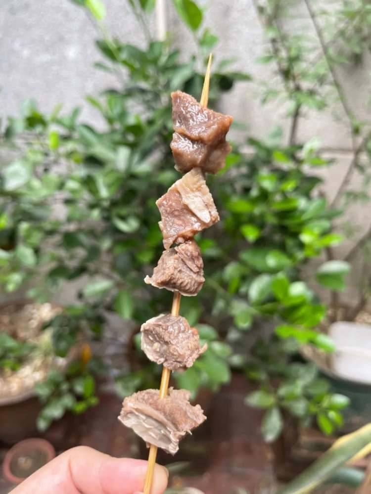 为了让这串牛杂看起来更值四块五,婉婷特地跑到自家院子给牛杂拍“写真”。(图/受访者提供)