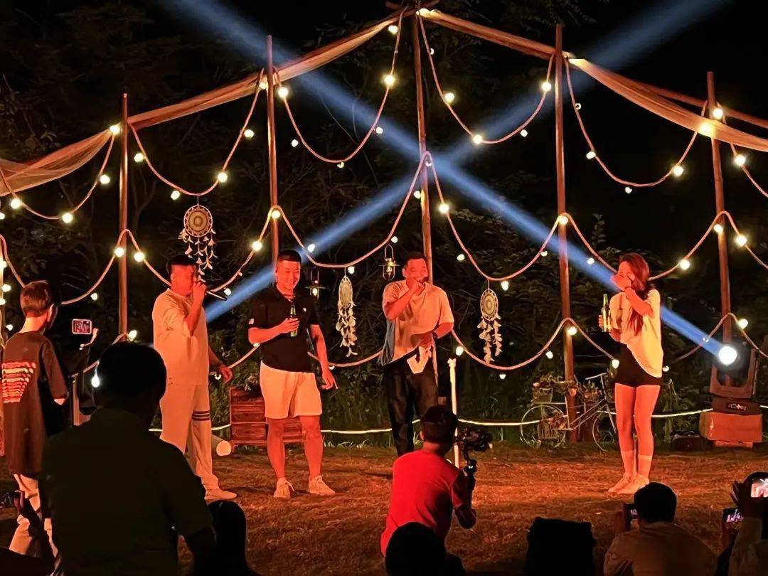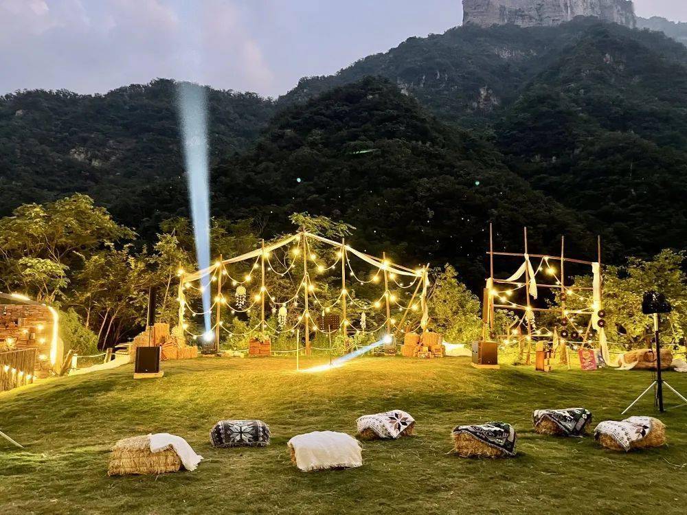 夜幕降临,曼妙的音乐和温柔的山风掠过,帐篷亮起了灯光,听到大家欢声笑语……