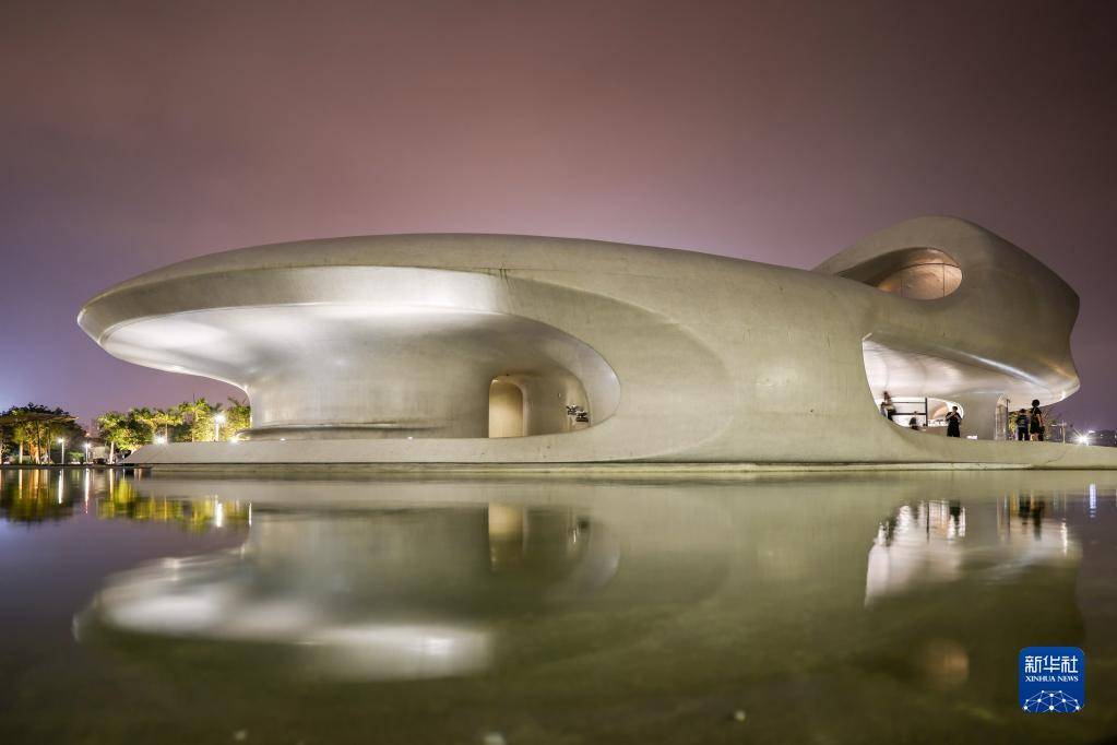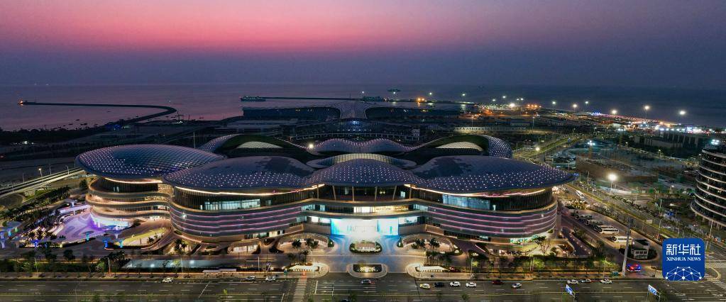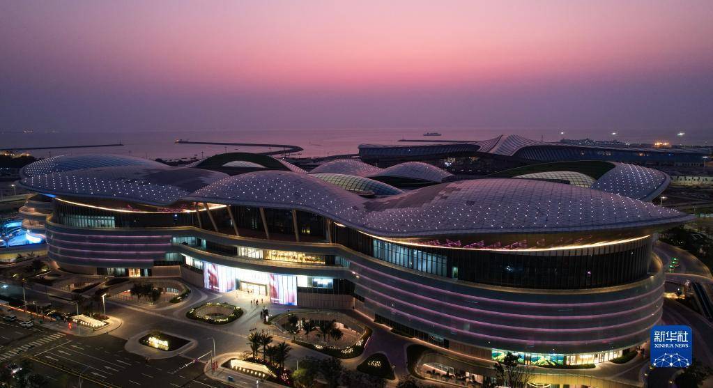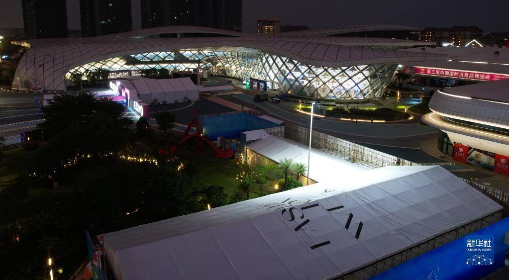 夜色中的第三届中国国际消费品博览会举办地海南国际会展中心(4月6日摄,无人机照片)。