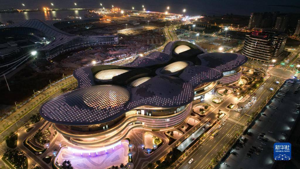 夜色中的海口国际免税城(4月4日摄,无人机照片)。