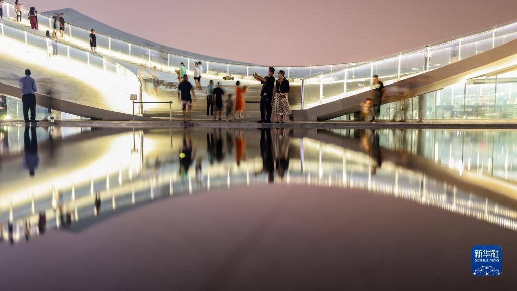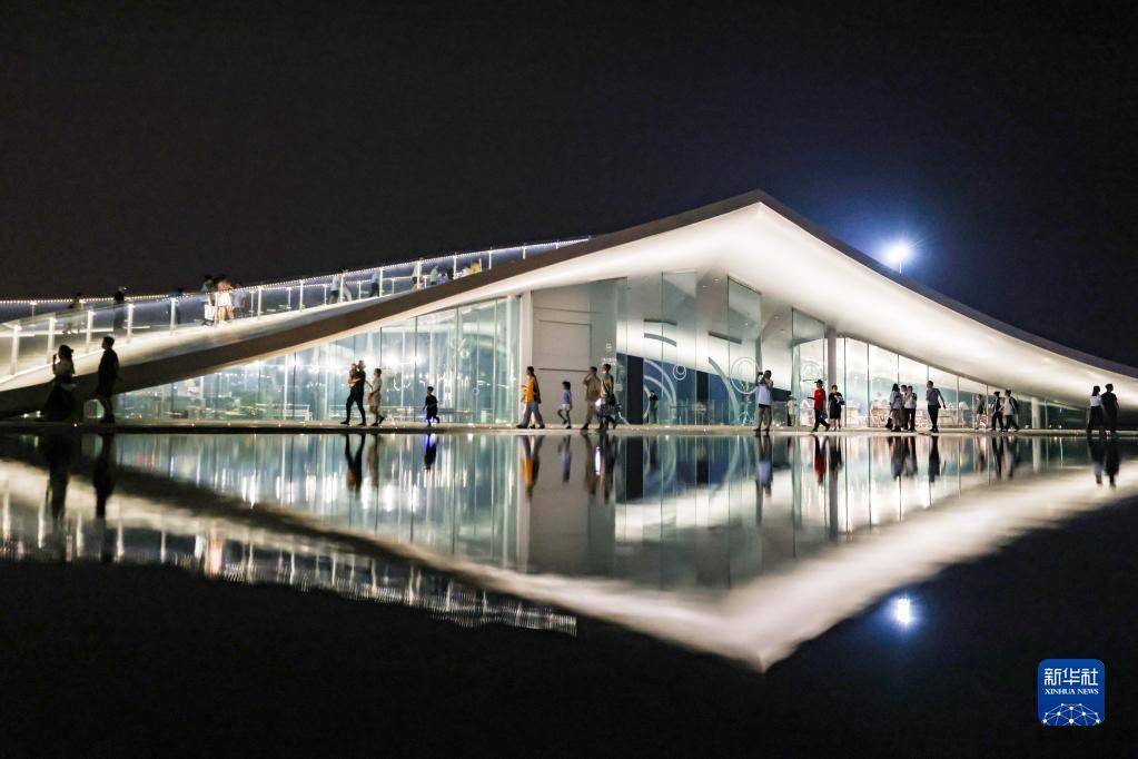 4月6日,游人在海口湾“天空之山”驿站观赏夜景。