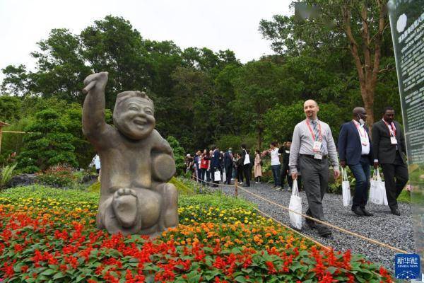 4月8日,外国嘉宾观赏2023粤港澳大湾区花展作品《文脉传承——烟火里的幸福成都》。
