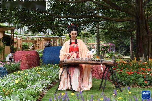 4月8日,一名女子在2023粤港澳大湾区花展现场进行民乐表演。