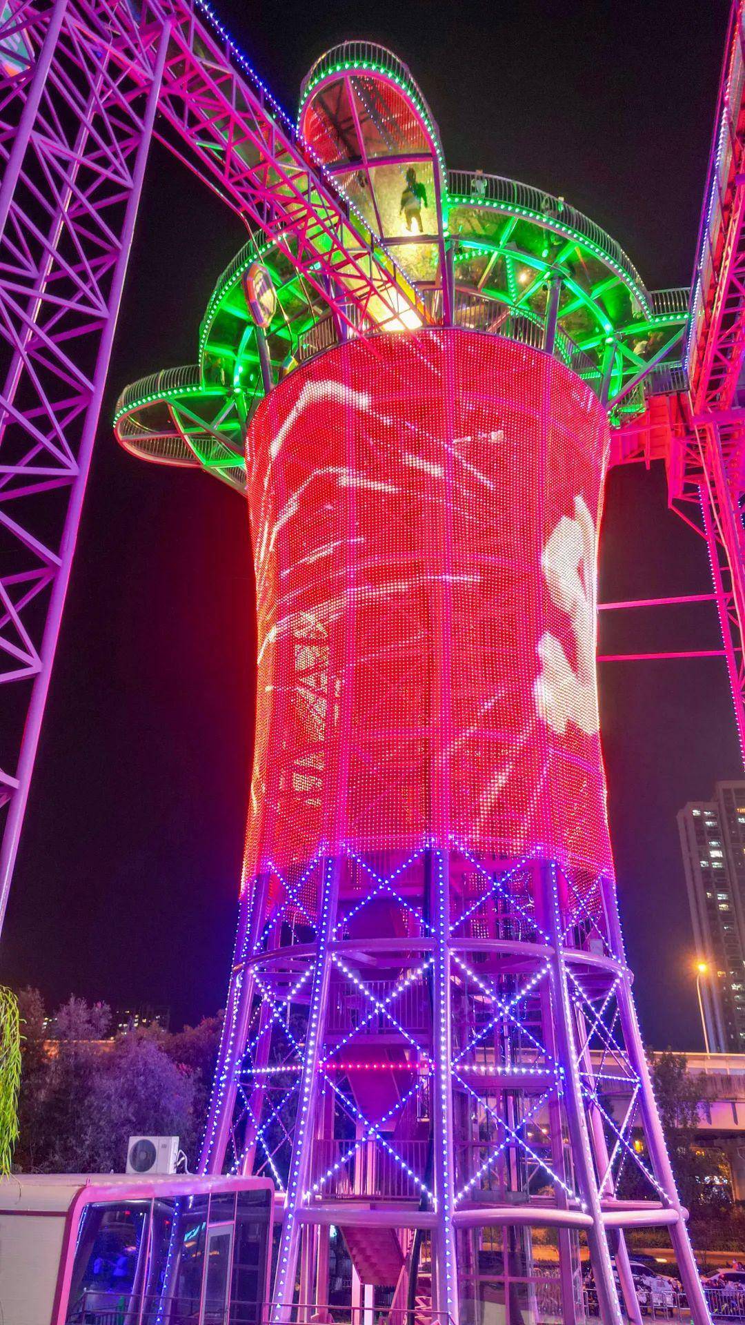 乘坐水滑时记得身体往前倾,先经过一次3转的转盘,中间经过30米的心形花廊,接近下站时再经过一次转盘随后滑入下站平台,霓虹灯之间穿梭,梦幻刺激的漂流至此结束,肾上腺素飙升100%!