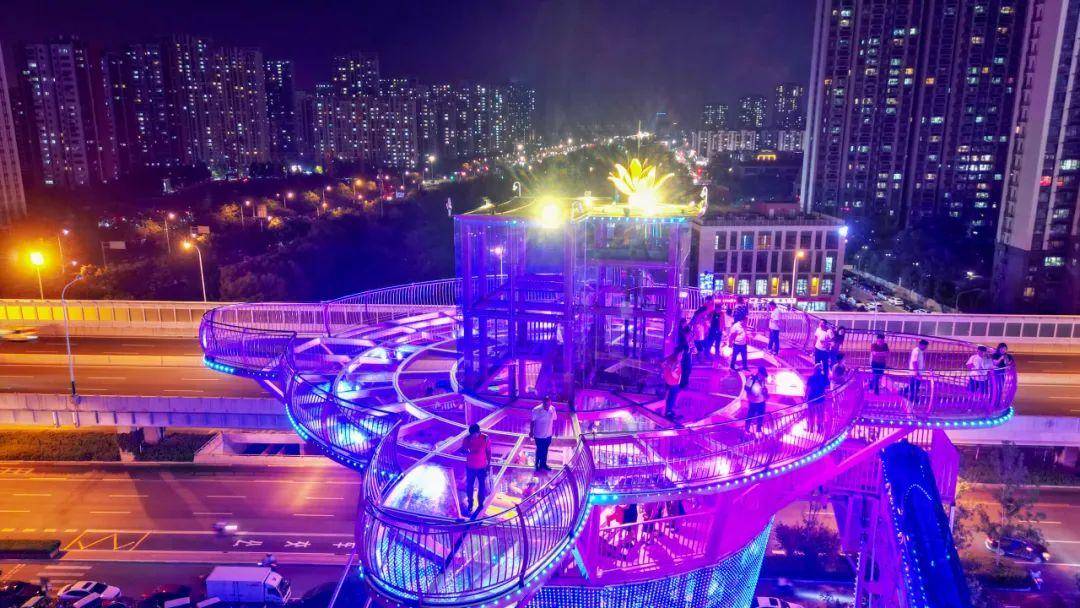 看到星河高空漂流的第一眼,就被浪漫到了:塔体造型上下宽中间窄,形似小蛮腰,顶部是济南市花荷花的造型,整体颜色为荷花粉,总高31.34米,寓意着三生三世的浪漫故事。
