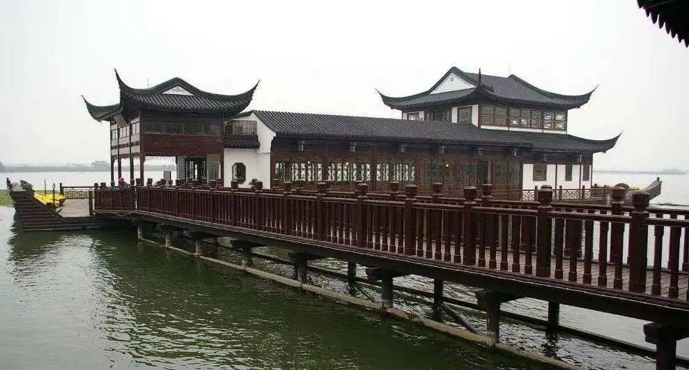 周庄镇北的白蚬湖,湖水清澈,微波荡漾,湖畔垂柳依依,曲廊亭台一派典雅。沿着鹅卵石小径穿过门洞,便踏上了一条13米长的木质栈桥。栈桥那一头便连着“周庄舫”。