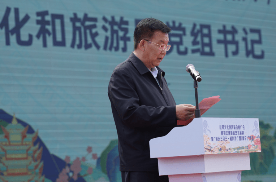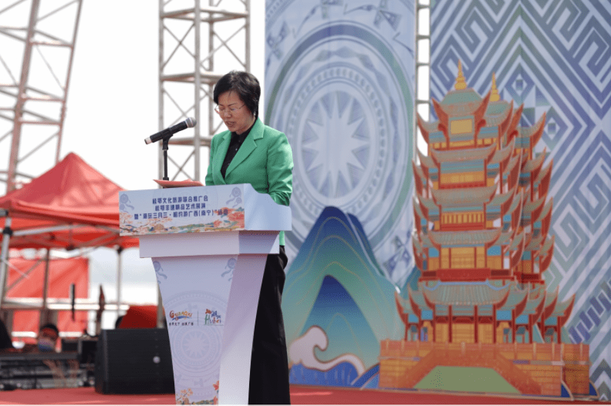 为推动广西“壮族三月三”民族节庆活动走向全国,进一步展示桂鄂两省(区)特别是广西(南宁)少数民族地区文化和旅游的独特魅力,4 月 8 日,桂鄂文化旅游联合推广会、桂鄂非遗精品艺术展演暨“潮玩三月三·相约游广西(南宁)”活动在湖北省武汉市汉口江滩举行。广西壮族自治区文化和旅游厅党组书记甘霖,湖北省文化和旅游厅党组书记、厅长李述永出席活动并致辞。湖北文化产业发展投资有限公司党委书记、董事长祁国钧,原空军驻鄂部队大校刘润才,广西旅游发展集团党委副书记陶社平,湖北省文化和旅游厅二级巡视员李波,广西壮族自治区文化和旅游厅二级巡视员黄耀林,南宁市人民政府副秘书长蔡志忠,南宁市文化广电和旅游局党组书记、副局长、市二级巡视员黄永久出席活动。