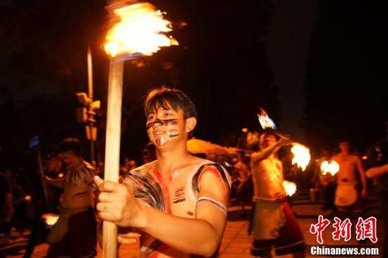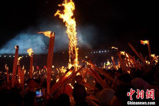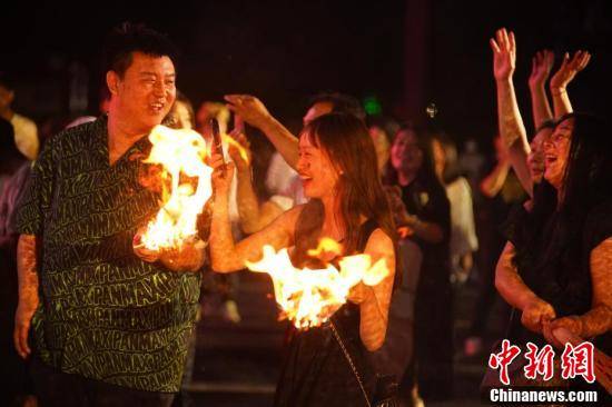游客手持火把跟随音乐起舞。中新社记者 刘冉阳 摄