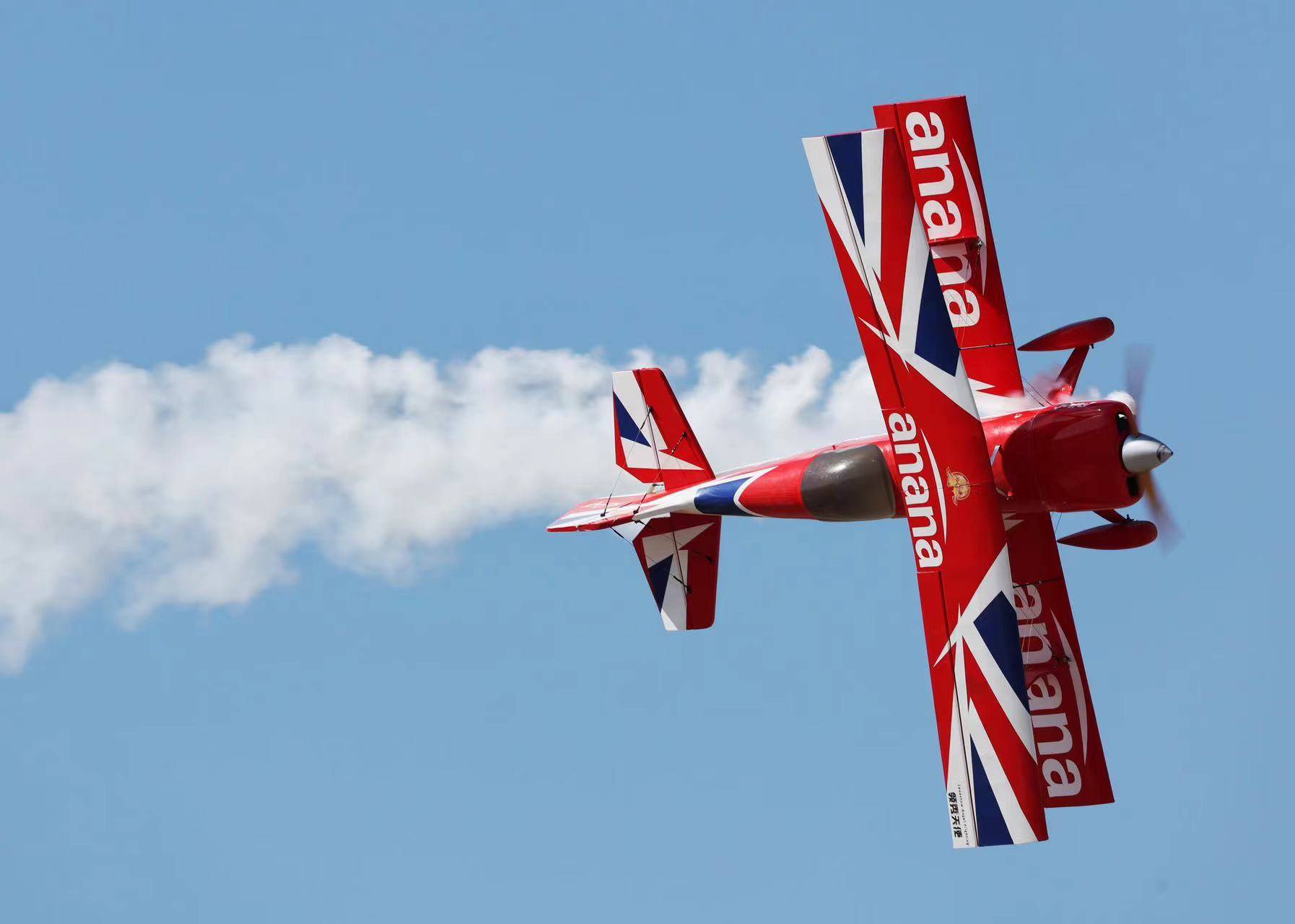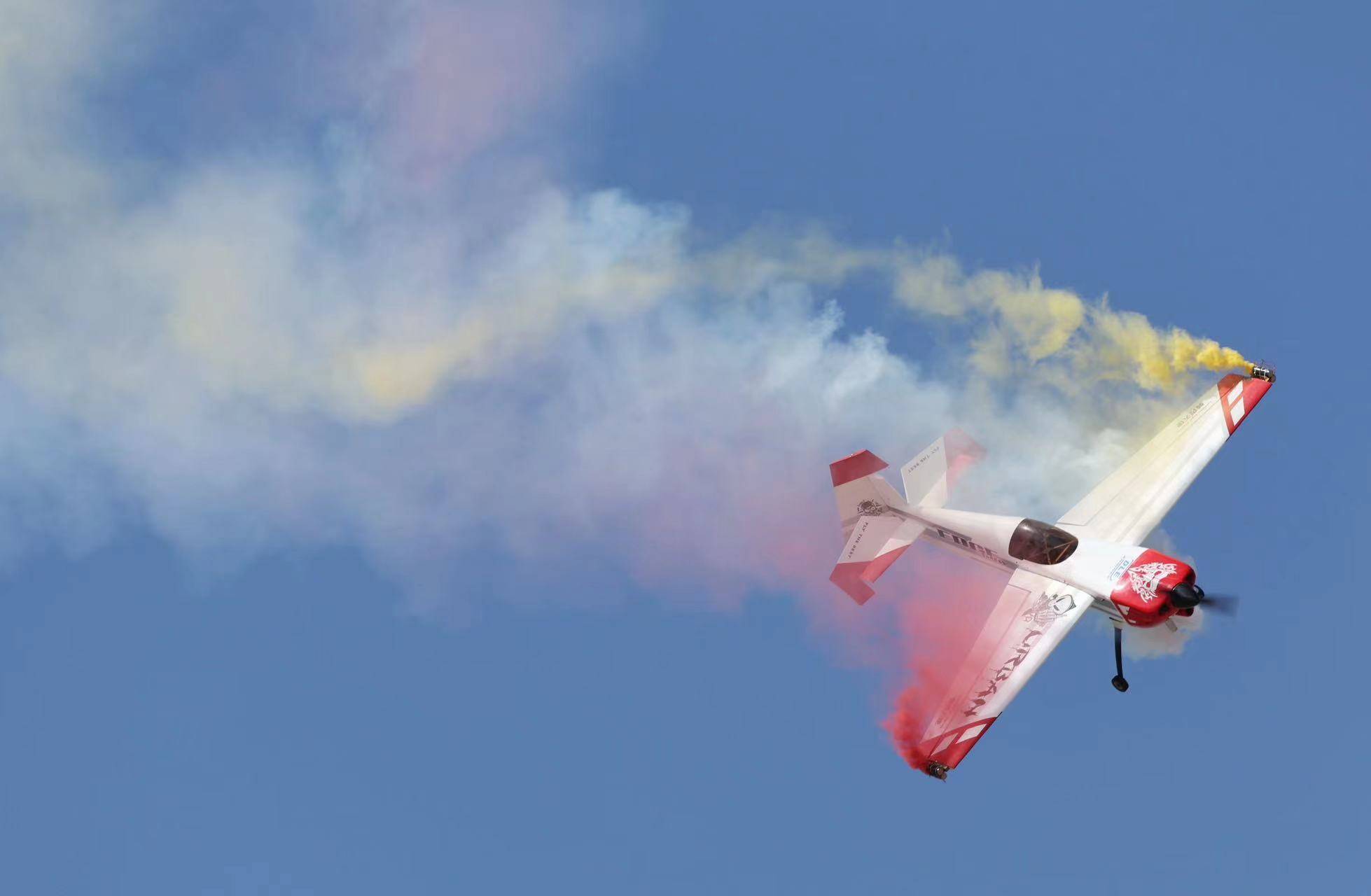 音乐声起,一架架大型特技飞机编组起飞,互相追逐、环绕,现场观众尖叫声连连。大型特级飞机降落后,一架双翼机出现在视野,庞大的机体径直冲向蓝天,在空中盘旋、摇摆,飞机放出的彩烟在空中留下一幅幅漂亮的图案……本次航模飞行表演由国内知名飞行表演队领衔,出场航模飞手以业内顶级冠军飞行员为主,在精彩纷呈的30分钟演出内,冠军飞手们遥控驾驶大型仿真航模、小型特级航模等专业设备进行了一系列极具视觉震撼的飞行表演。
