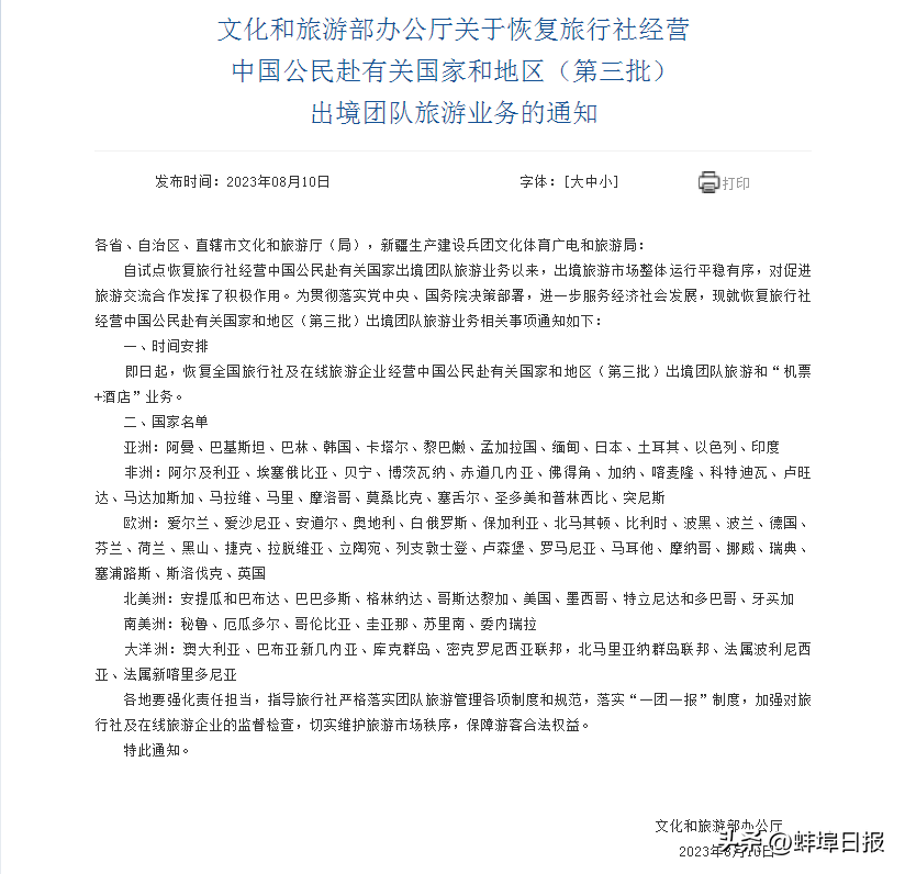 即日起,恢复全国旅行社及在线旅游企业经营中国公民赴有关国家和地区(第三批)出境团队旅游和“机票+酒店”业务。