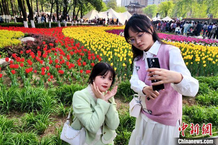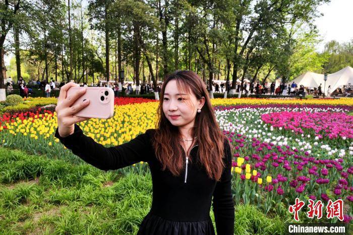 图为民众正在郁金香花海旁驻足拍照。 梅镱泷 摄