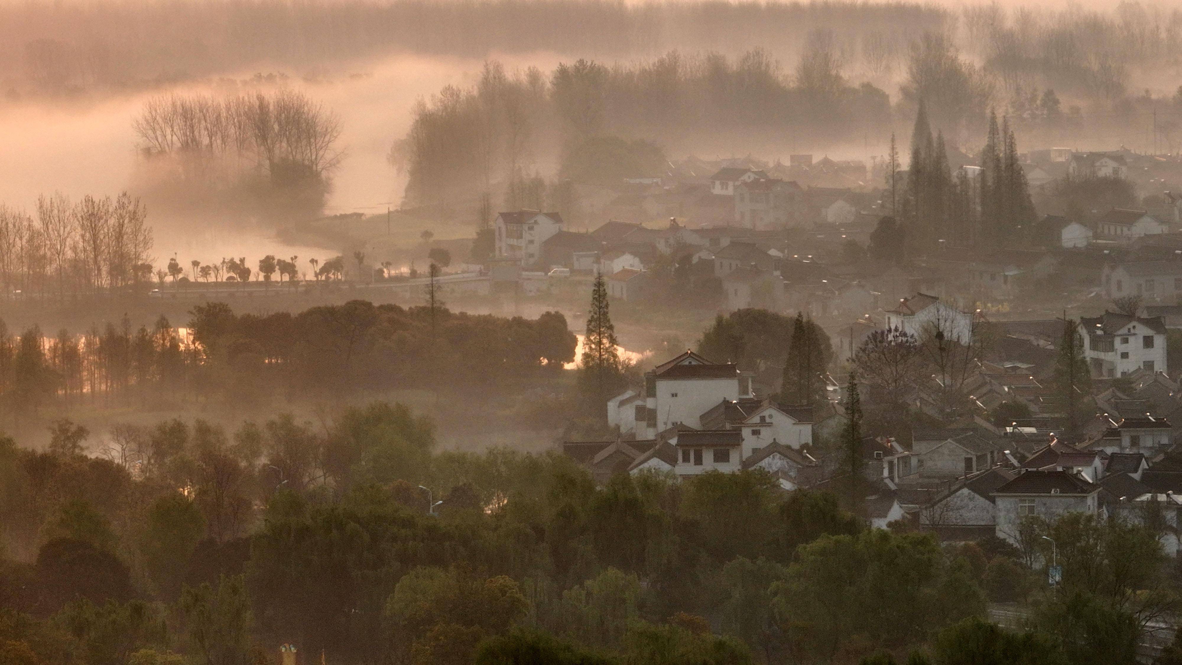 日出时分,江苏省泰州市姜堰区的溱湖国家湿地公园及其周边晨雾缭绕,构成一幅美丽的春晨画卷。