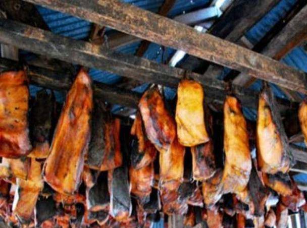而不嫁不娶的习俗还不是最为奇怪的,当地出嫁的时候还有一种食物来招待贵客才是让人感到“郁闷”的地方。这里家家户户还有吃”臭猪肉“的习俗,所谓的”臭猪肉“,就是在猪还活着的时候挖出内脏,而后用谷物等农作物来填满代替,再拿到太阳底下晒干。