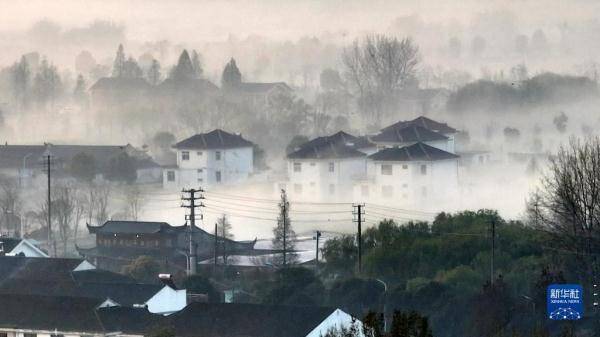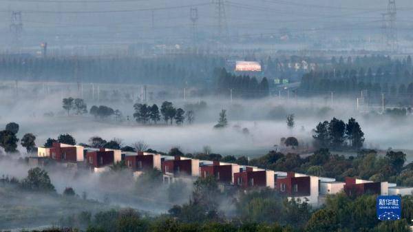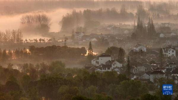日出时分,江苏省泰州市姜堰区的溱湖国家湿地公园及其周边晨雾缭绕,构成一幅美丽的春晨画卷。
