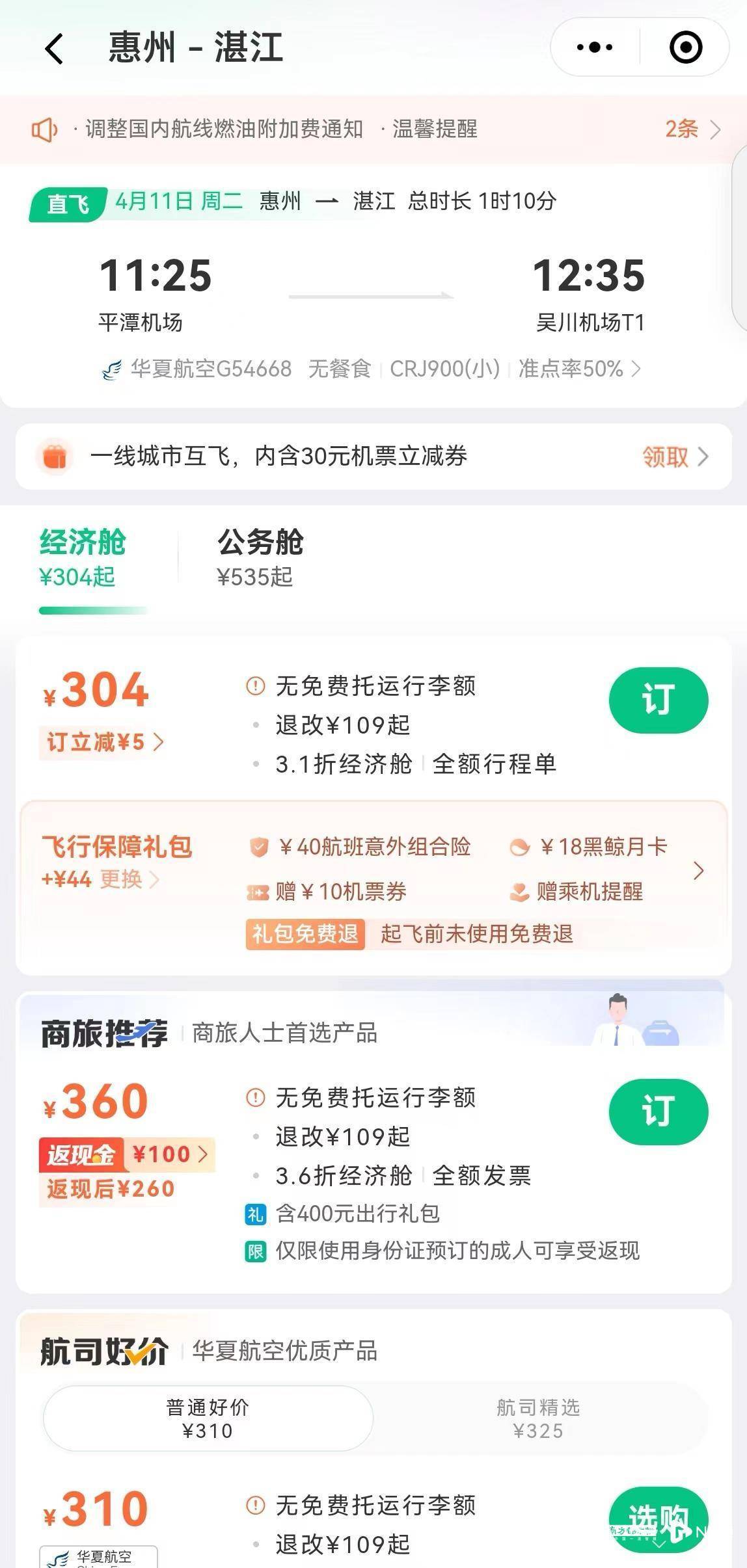 南都记者随机打开某社交软件机票订购查询到,4月11日惠州到湛江机票3.1折单程304元,往返608元。而在某APP机票预订,最低票价为303元。3、4月惠州天气持续下雨,很多没看过太阳的你是否也准备来一趟说走就走的旅行呢?