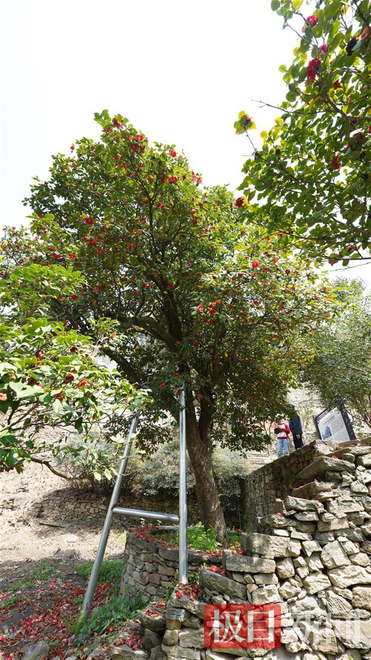 这棵山茶树高8.5米,胸径约41厘米,一个人基本可以环抱住,“山茶古树生长速度比较慢,所以500多年了,它的树干也不是特别粗。”吴恬解释。