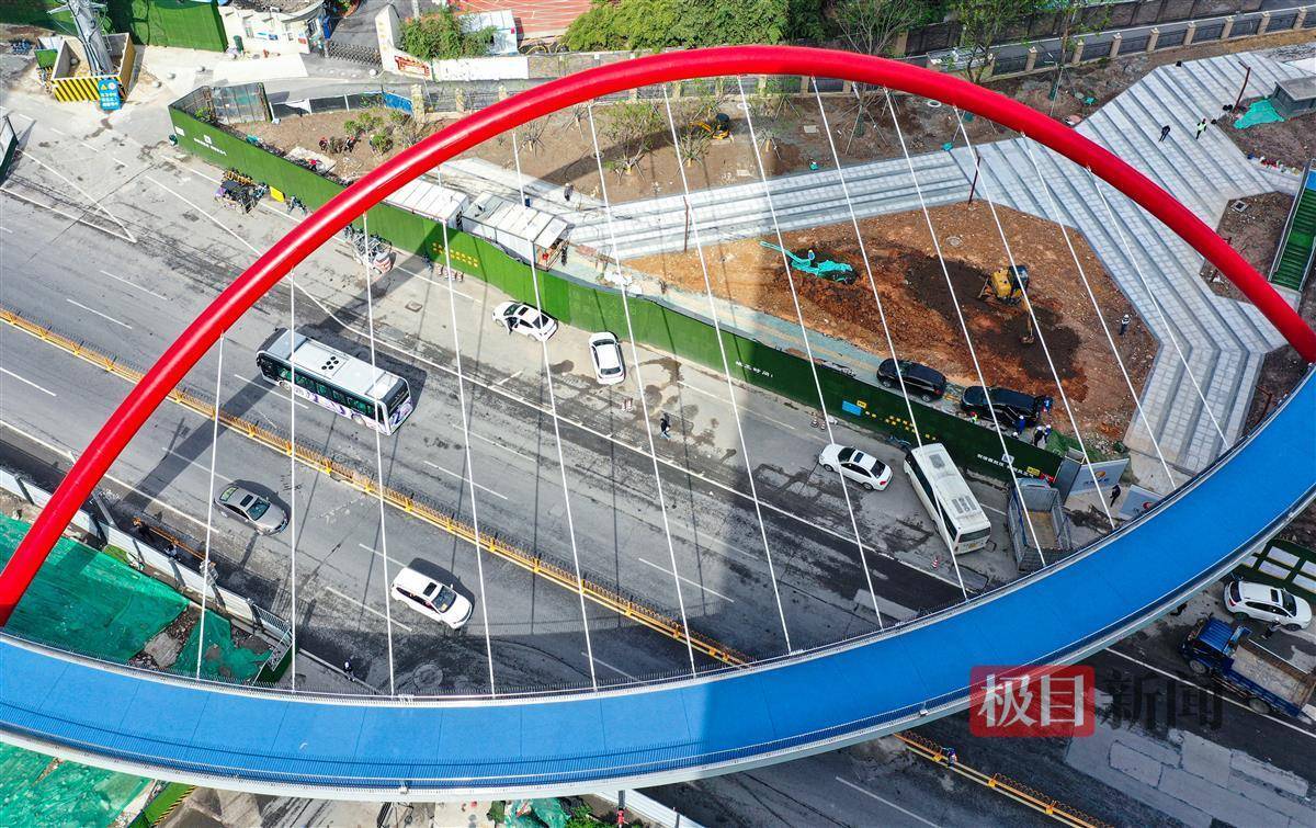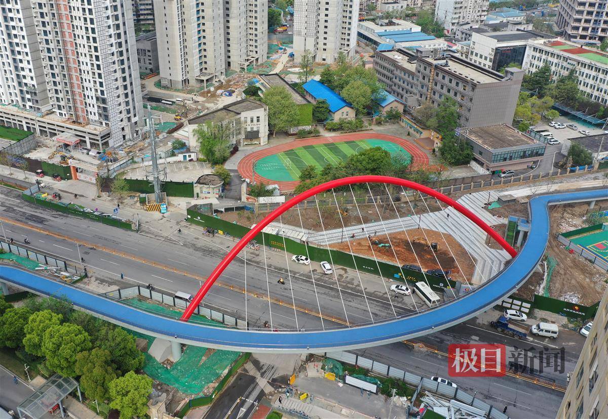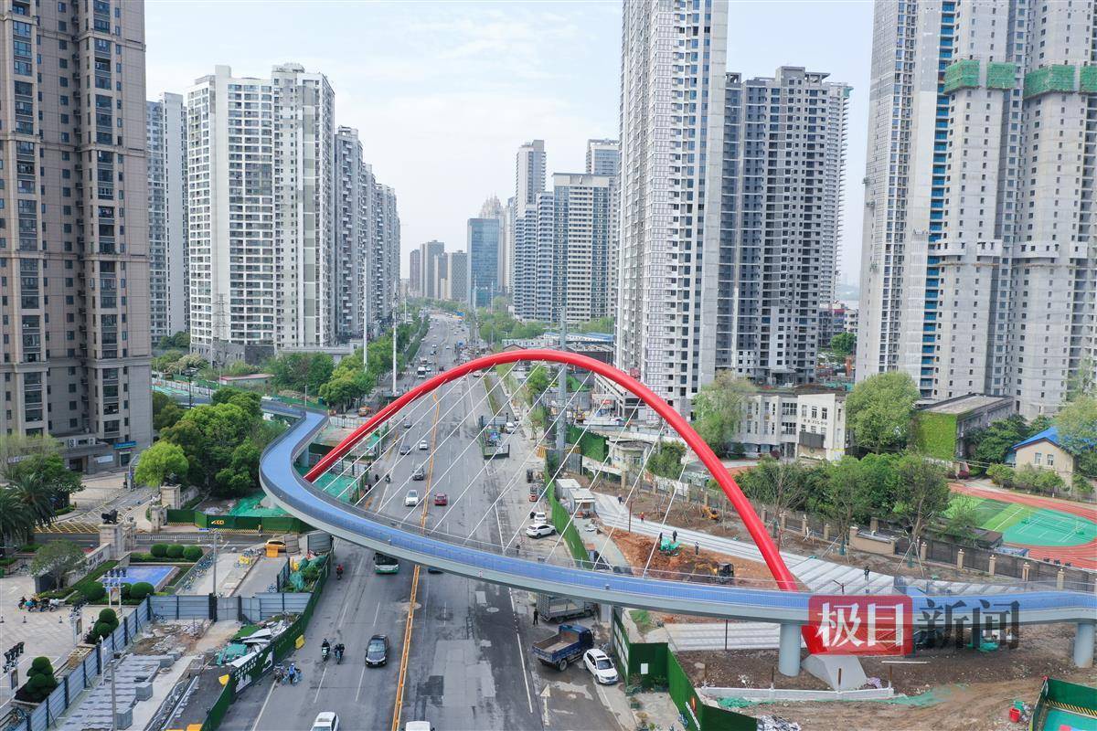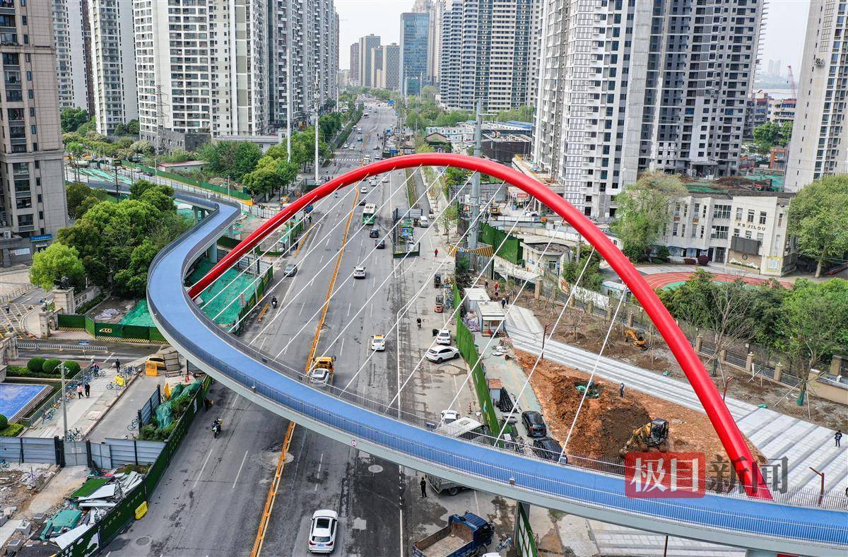4月8日,极目新闻记者在武汉和平大道看到,一道红色弯拱,斜跨和平大道,地上看像一张拉满的弓,俯瞰像只大眼睛的人行栈桥主体工程已竣工,工人师傅忙着整理绿化带。据了解,该桥在通过验收后投入使用。