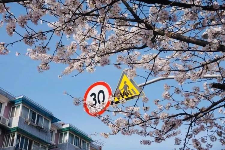 路牌、学校、电话亭、居民楼,寻常的场景在樱花的映衬下,像加了滤镜一般诗意唯美。