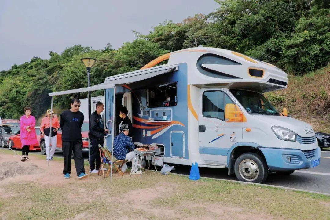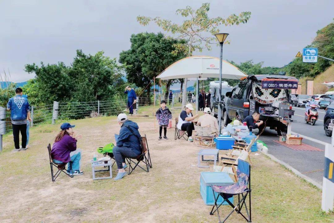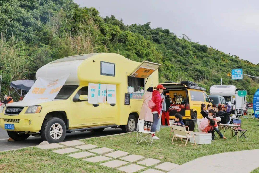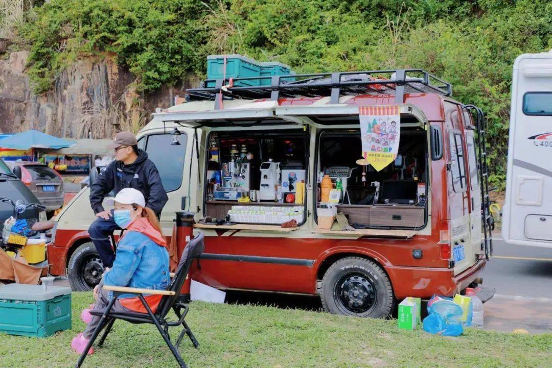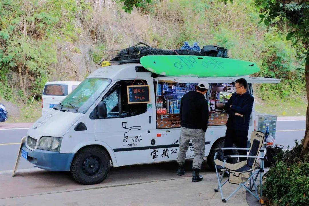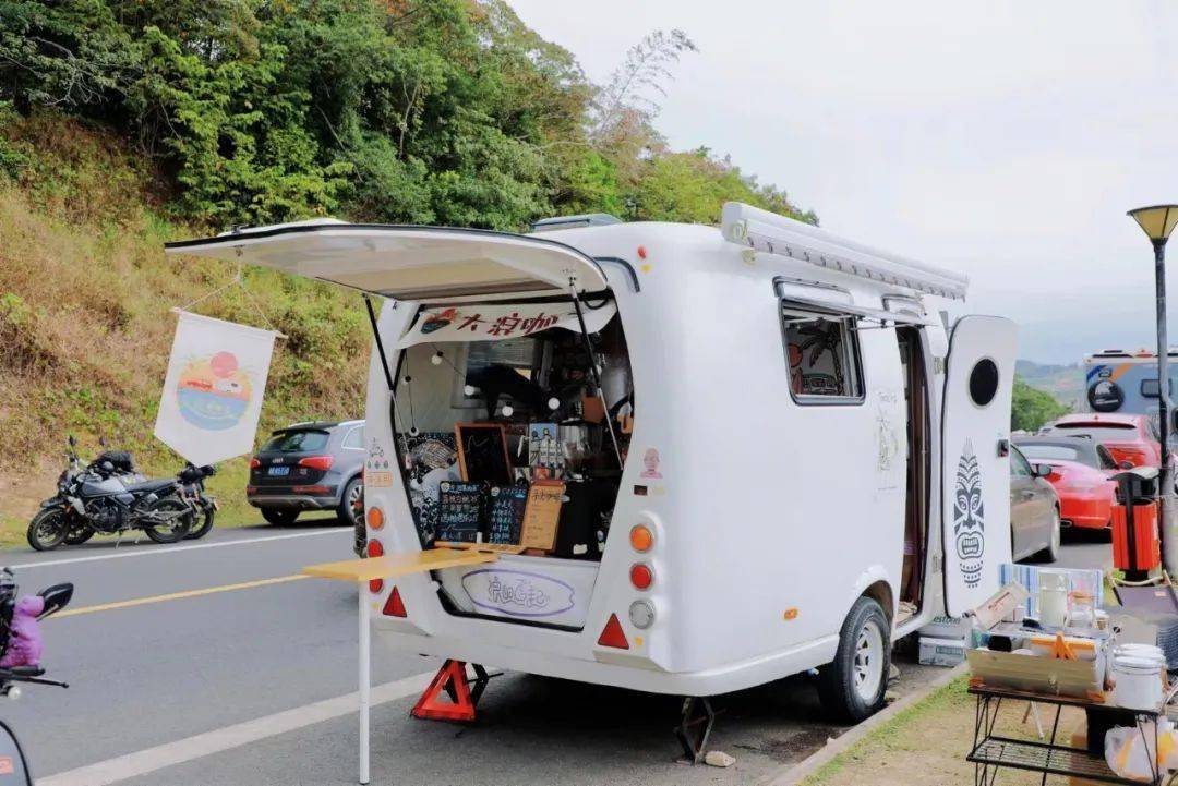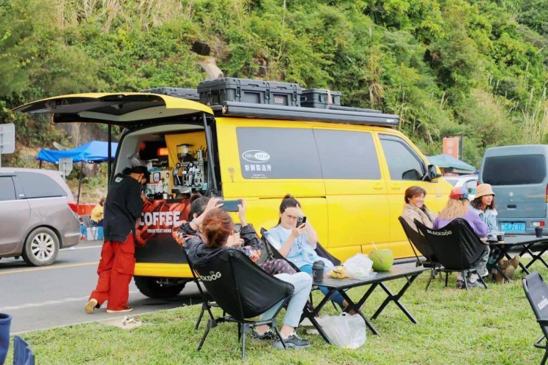 一条蓝色的滨海公路,一辆辆移动咖啡车,一张露营桌、几把露营椅…过往的游客都被这个路边休闲的咖啡车吸引。