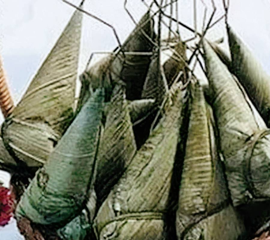 粽粑叶把黑糯米包起来,用稻草芯捆紧,将粽子10个捆在一起,用冷水浸泡2小时后入锅煮1小时至熟,吃时去掉粽粑叶蘸糖,软糯清香,深受大家喜爱。