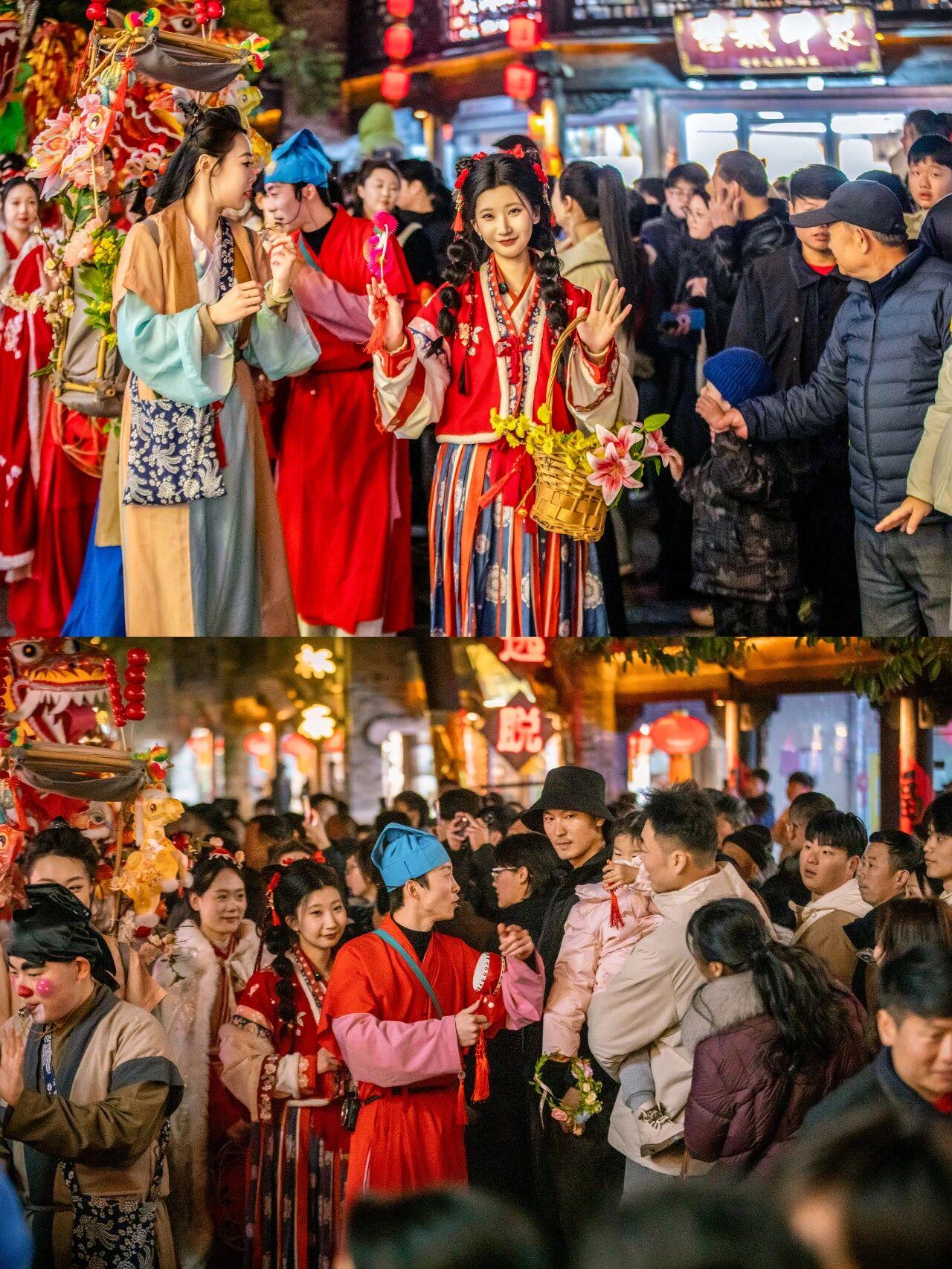 大红灯笼挂满檐角,人们漫步青石板路,走走停停,看一出戏,尝一口年味。每一条巷子都飘着欢声,每一个转角都挤满身影,流动的人群汇成了这座城最动人的风景。