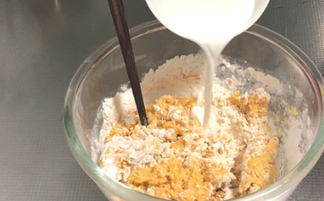 因為紅薯是婆婆秋末就存儲起來的,水分基本上都已經蒸發瞭,這樣的紅薯吃起來非常的香甜,把蒸熟的紅薯放在盆裡面,搗成紅薯泥,然後在加入500克的高筋面粉,一個雞蛋,然後攪拌成面絮,加入30克玉米油攪拌均均,再加入半袋牛奶和5克酵母粉攪拌均勻。