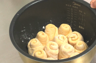 電飯煲底部抹油,撒一層幹面粉,芝麻,白糖,放入小面包,擺放整齊,然後讓面團進行二次醒發。