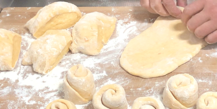 然後揉成軟面團,我們今天做的這個做法非常的簡單,不用把面團反復揉搓起層,直接讓面團發酵到兩倍大,然後在案板上鋪上一層面佈,然後把面團揉成長條,切成10等份,把切好的每一份都搟成薄皮,卷起來切成兩邊半。底部沾上幹面粉,這樣小面包的雛形就做好瞭。