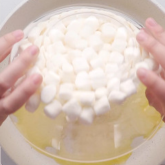 2,棉花糖去掉外包裝備用,先取適量的無鹽黃油,倒入鍋內(註意要用不粘鍋哦)開小火加熱,融化後倒入準備好的棉花糖,隨即不停的攪拌,直到所有的棉花糖全部融化為止;接著倒入準備好的奶粉,攪拌均勻。