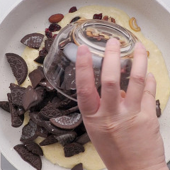 3,此時可以把蔓越莓幹,奧利奧塊,堅果,熟花生的等(這些東西都可以根據自己的愛好放食材比如:草莓幹,葡萄幹等)倒入鍋內,接著用刮刀不停的翻拌均勻。(攪拌的過程中由於幹性的食材加粘稠的棉花糖,所以不好翻拌,大傢要耐著性子,翻均勻)。