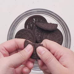 1,準備材料,檢查一下奧利奧餅幹的生產日期,然後把奧利奧餅幹去掉外包裝,擰開兩片餅幹再用刀片刮掉餅幹的夾心,所有要用的餅幹都刮掉夾心後,把所有的餅幹掰碎備用(一個圓餅幹掰成三四塊即可)。