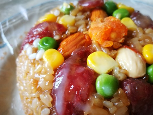 菜名:咸鴨蛋黃肉松八寶飯;配料:糯米,肉松,糖,咸鴨蛋黃,玉米,青豆,火腿,幹貝兩把,杏仁,廣式香腸兩根,黃酒,清水,豬油,老抽,生抽。特色:咸香適宜,軟糯香甜。