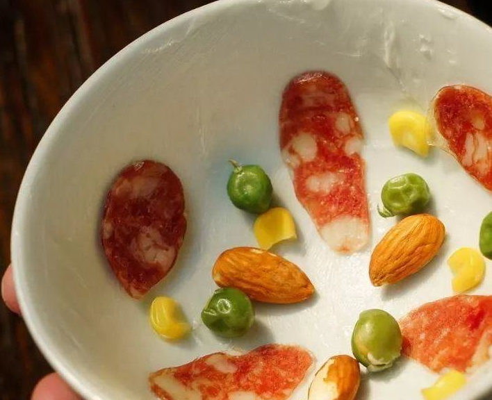 4,取一合適的碗,碗裡面抹上一層熟豬油,碗底先整齊的擺幾片香腸,再擺幾個杏仁,接著放入玉米粒青豆做點綴,最後鋪一層蒸熟的糯米,輕輕按壓一下壓實,(但要註意不要用力過猛,否則擺放的東西會移位瞭)接著在上面再鋪一層蒸熟的糯米,輕輕壓實,接著再鋪一層咸蛋黃和肉松,也是輕輕按壓緊實,最後在鋪一層熟糯米,繼續輕輕按壓緊實。