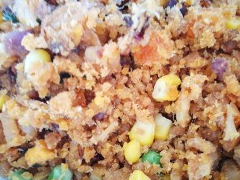 2,蒸肉的過程中,我們可以把玉米洗凈剝粒,青豆適量淘洗幹凈放入蒸籠裡面蒸熟備用,咸鴨蛋煮熟(直接放蒸籠一起蒸也可以,因為熟的快最好放上層);待咸鴨蛋煮熟後,取出剝去蛋白隻留蛋黃放入一幹凈的碗內,放入肉松,熟豬油(沒有熟豬油的就隨即加熱融化),搗碎咸鴨蛋黃和肉松豬油攪拌均勻。此時再把蒸熟的火腿粒,玉米粒,青豆,幹貝也一並加入裡面攪拌均勻備用。